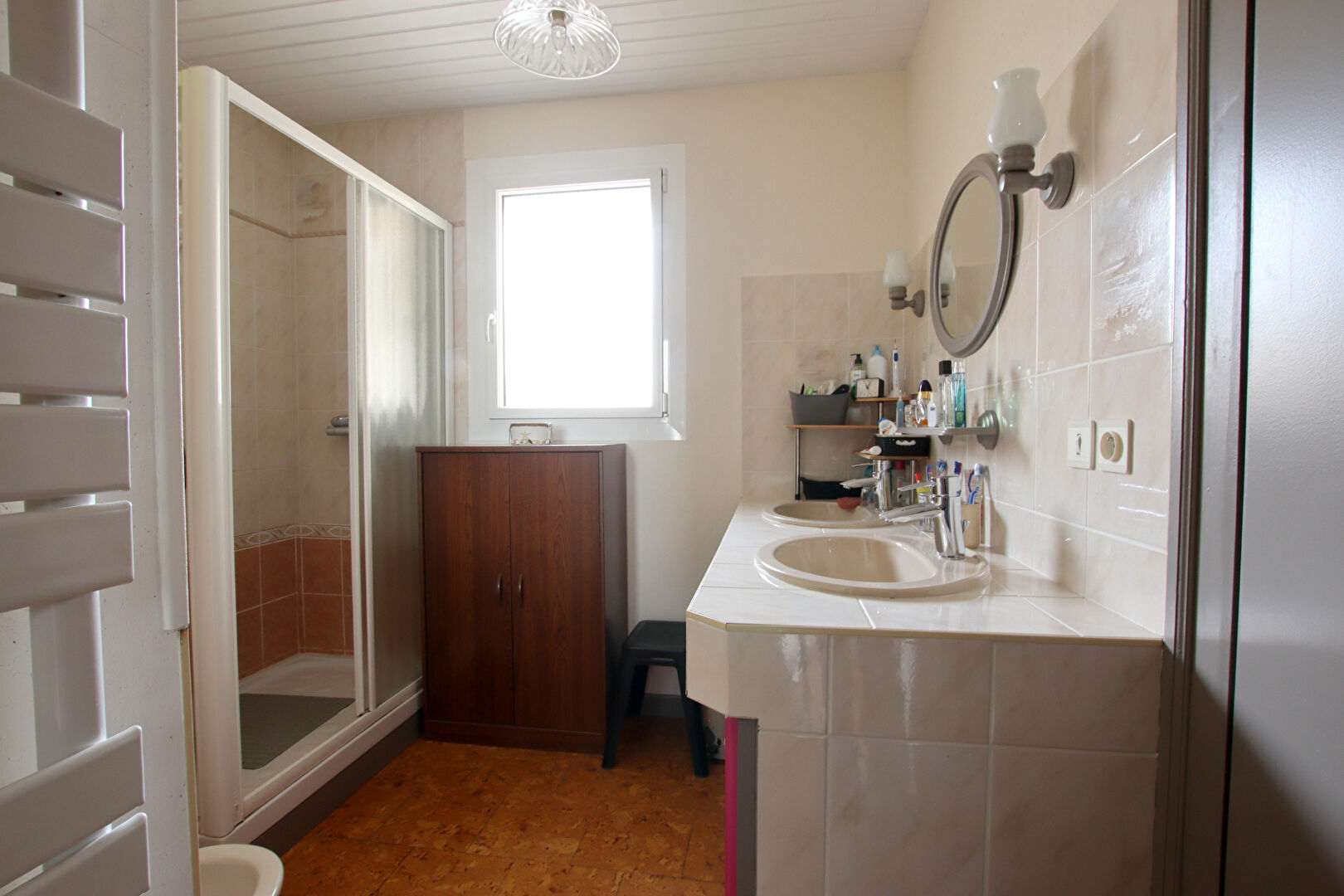Une seconde salle d'eau avec douche, plan double vasques et grand placard,